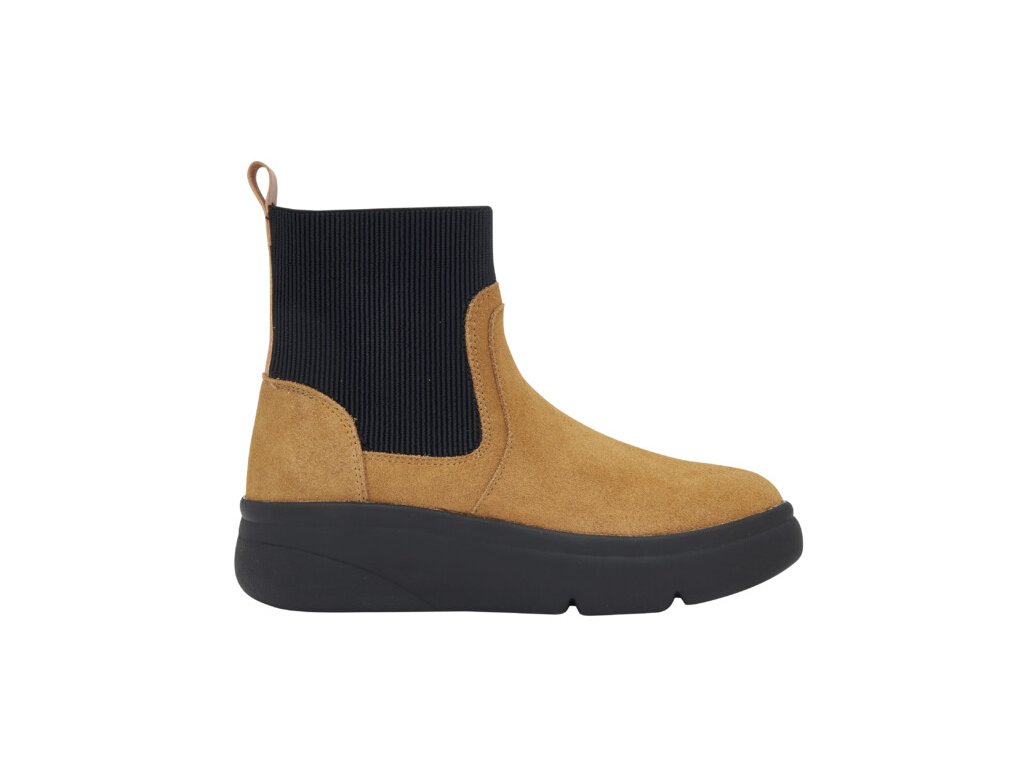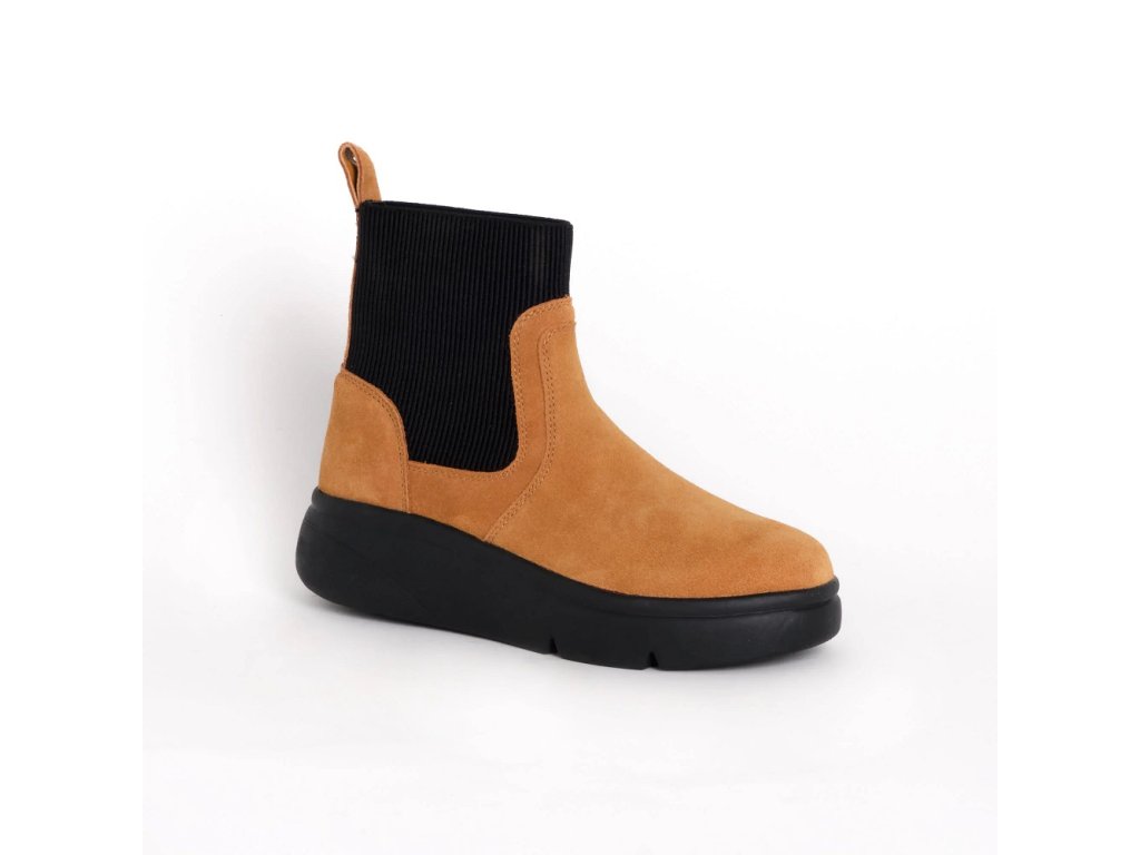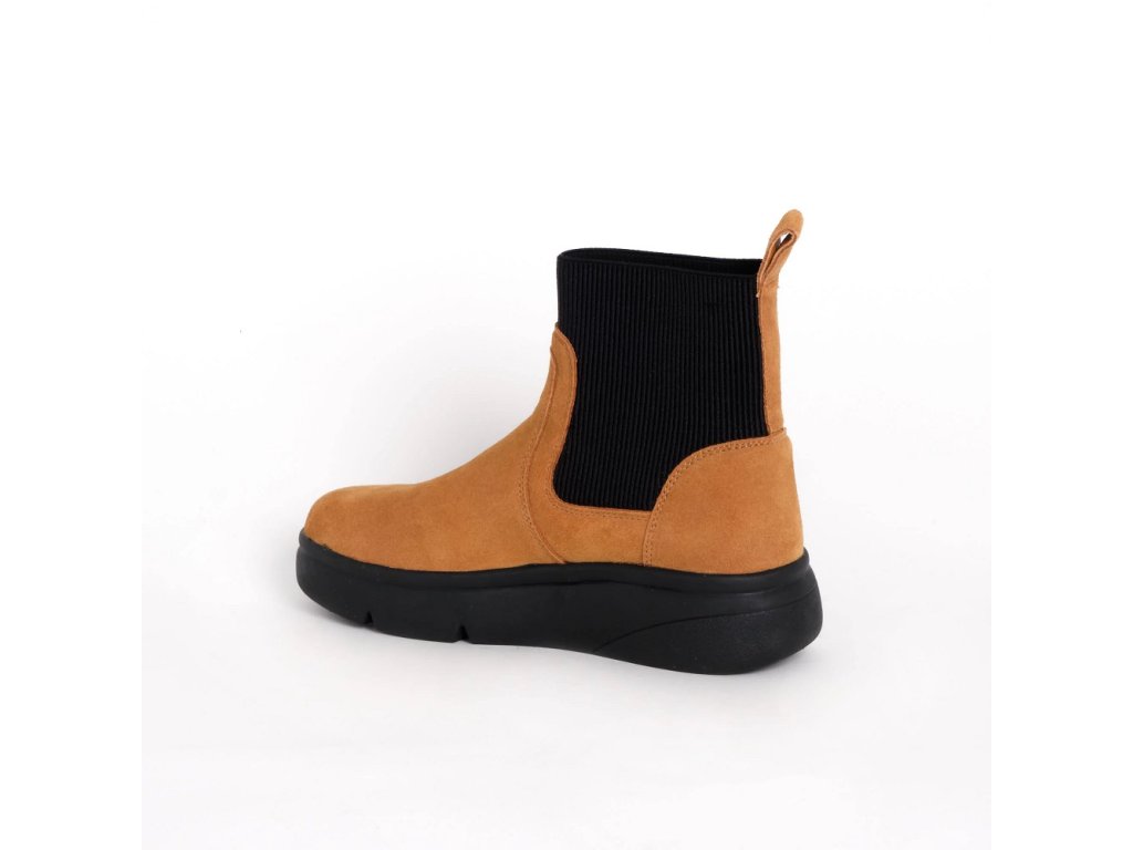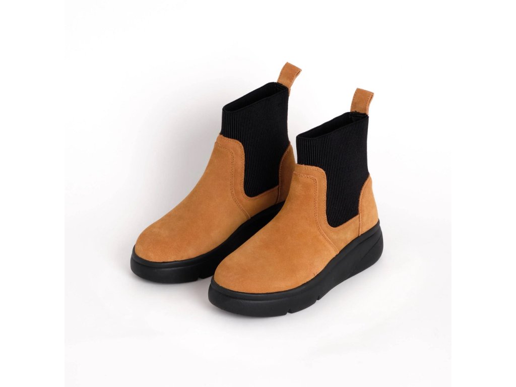 Spodní část svršku je zhotovena z jemné broušené kůže suede, což dodává botám elegantní vzhled. Svršek je vyroben z elastického textilu, což usnadňuje jejich nazouvání a zvyšuje pohodlí při nošení. Kombinace světle hnědé barvy s černou vytváří stylový kontrast, který je moderní a vkusný.