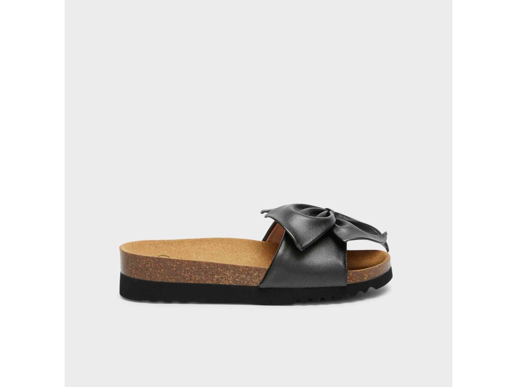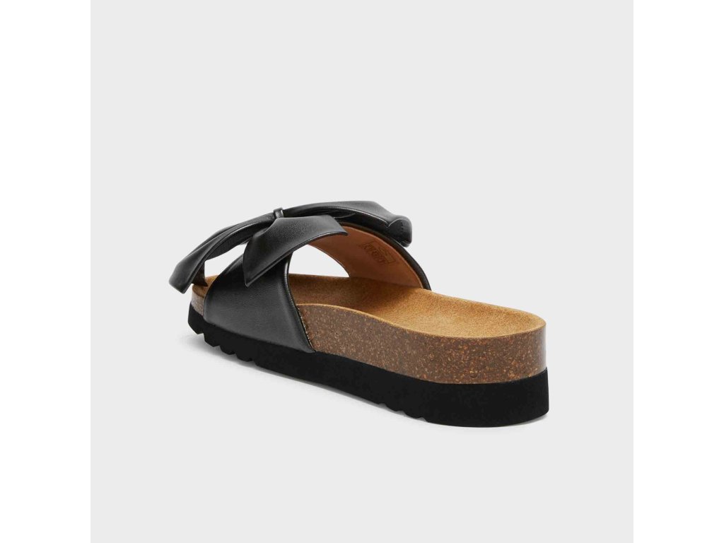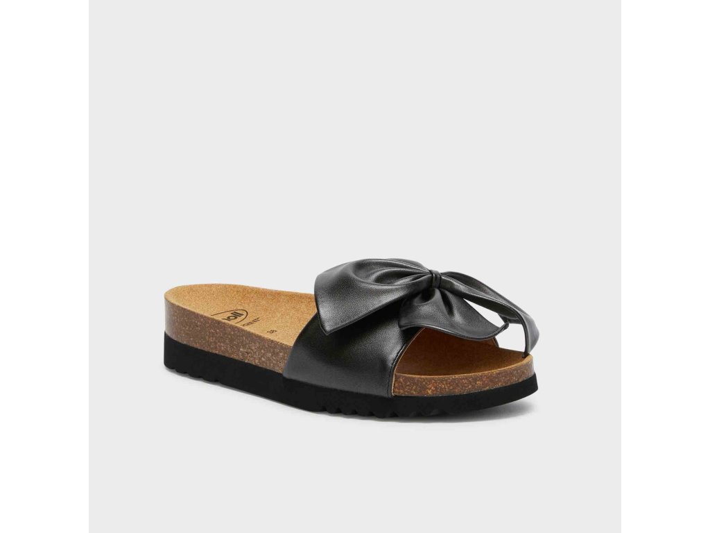 Scholl BOWY černé dámské zdravotní pantofle jsou elegantním modelem pro letní období, který zdobí velká mašle a stane se nepřehlédnutelným doplňkem každého letního outfitu. Tato dámská obuv vypadá velice elegantně na noze, je mimořádně pohodlná a je vybavena zdravotní stélkou Bioprint, která kombinuje přírodní korek a pryž pro udržení nohy ve správné poloze.