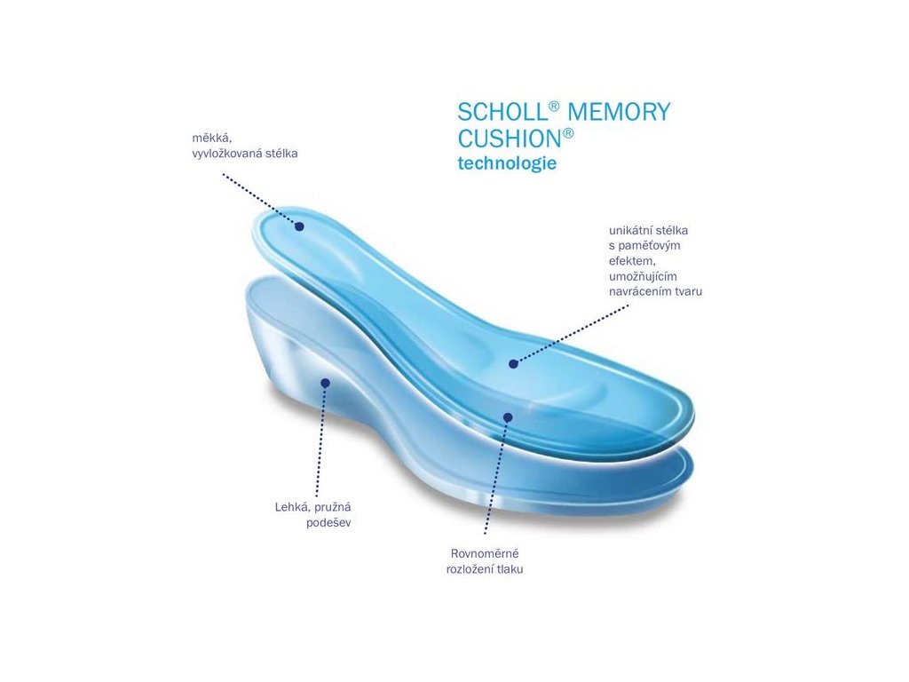 Memory Cushion je inovativní řešení firmy Scholl pro lepší podporu a odpružení vaší nohy. Paměťový polštář eliminuje bolesti nohou a únavu rovnoměrným rozložením tlaku na chodidlo a absorbuje otřesy způsobené chůzí. Rovnoměrným rozložením tlaku na chodidlo zajišťuje jeho lepší podporu a snižuje tlak na nejvíce zatížené body.