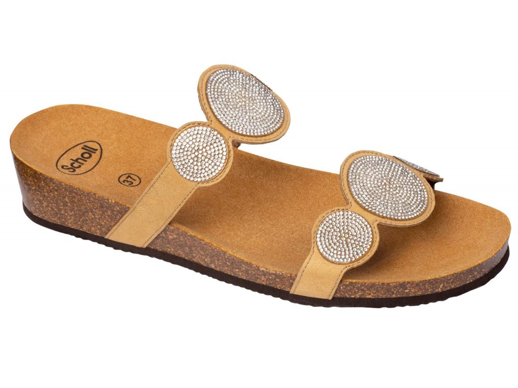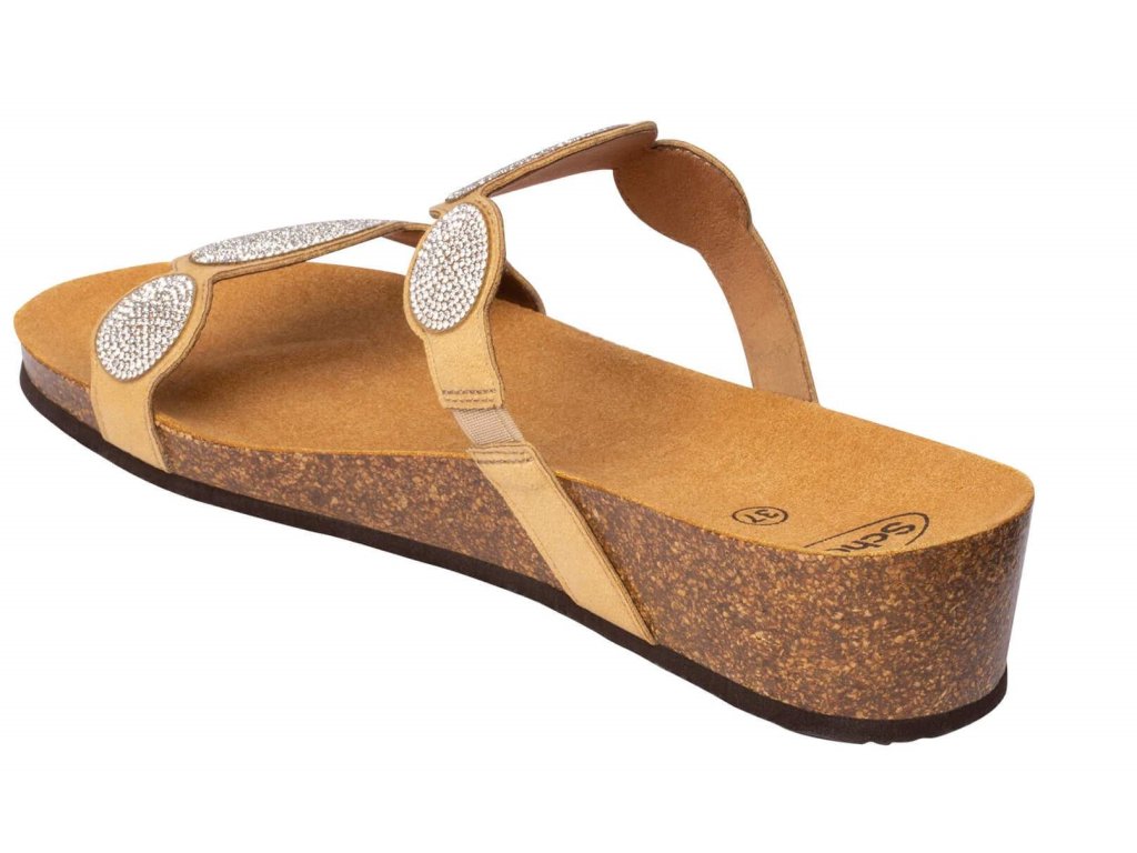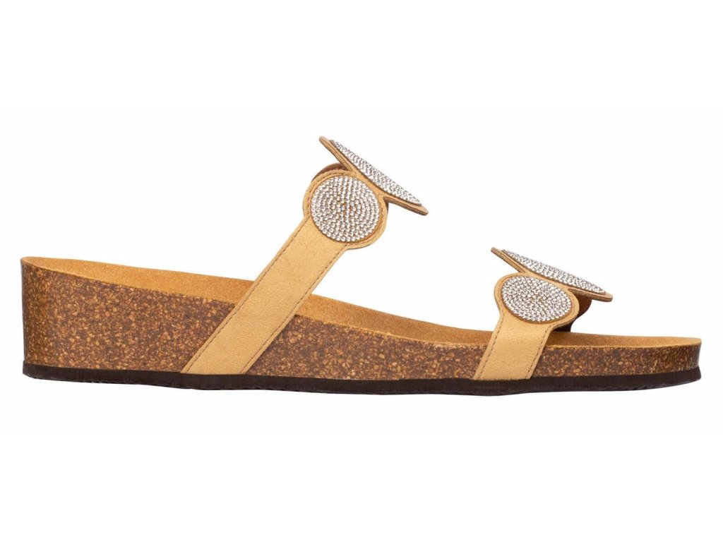 Jedná se o pantofle na klínku ozdobené zirkony s korkovým klínkem a semišovou stélkou. Barva béžová