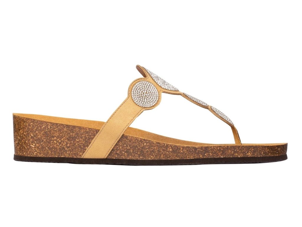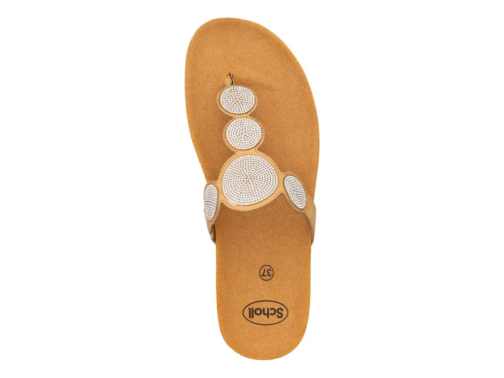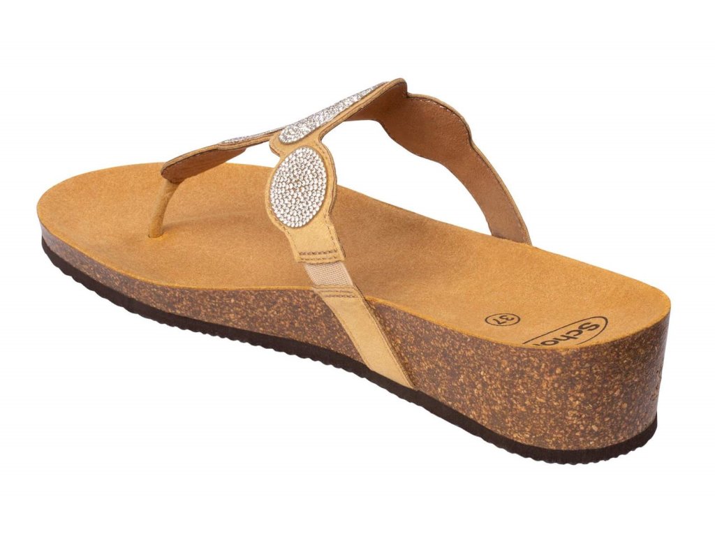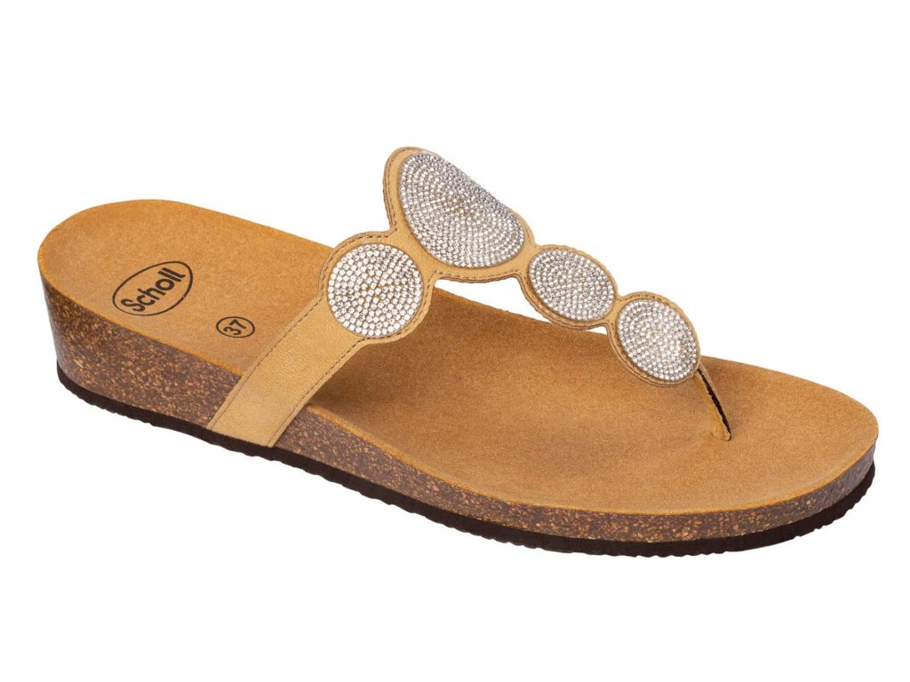 Model Sharon Flip Flop je novinka od firmy Scholl. Jedná se o pantofle - žabky na klínku ozdobené zirkony s korkovým klínkem a semišovou stélkou. Barva béžová